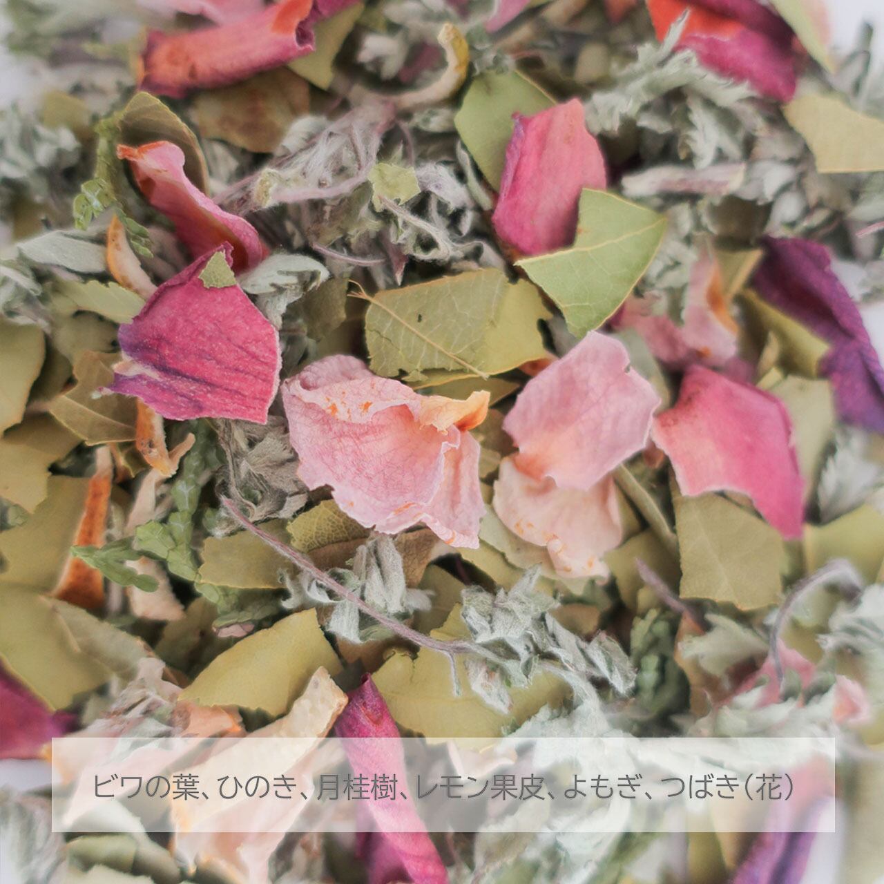 ビワの葉、ひのき、月桂樹、レモン果皮、よもぎ、つばき(花)