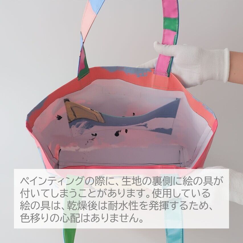 名前の由来は…テントの商品をつくり始めた頃、仲間(利用者さん)によるペインティングの仕事を水曜日に行っていたため「水ようびのトート」。(今は月曜日と水曜日に行っています)