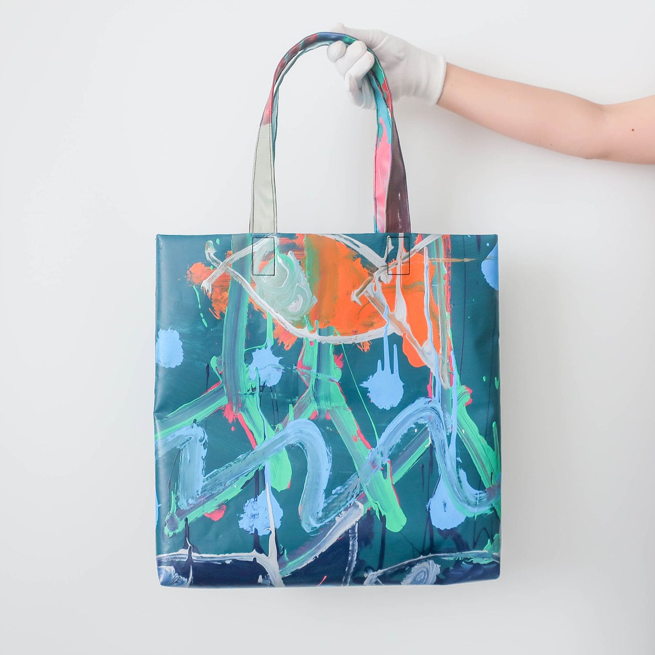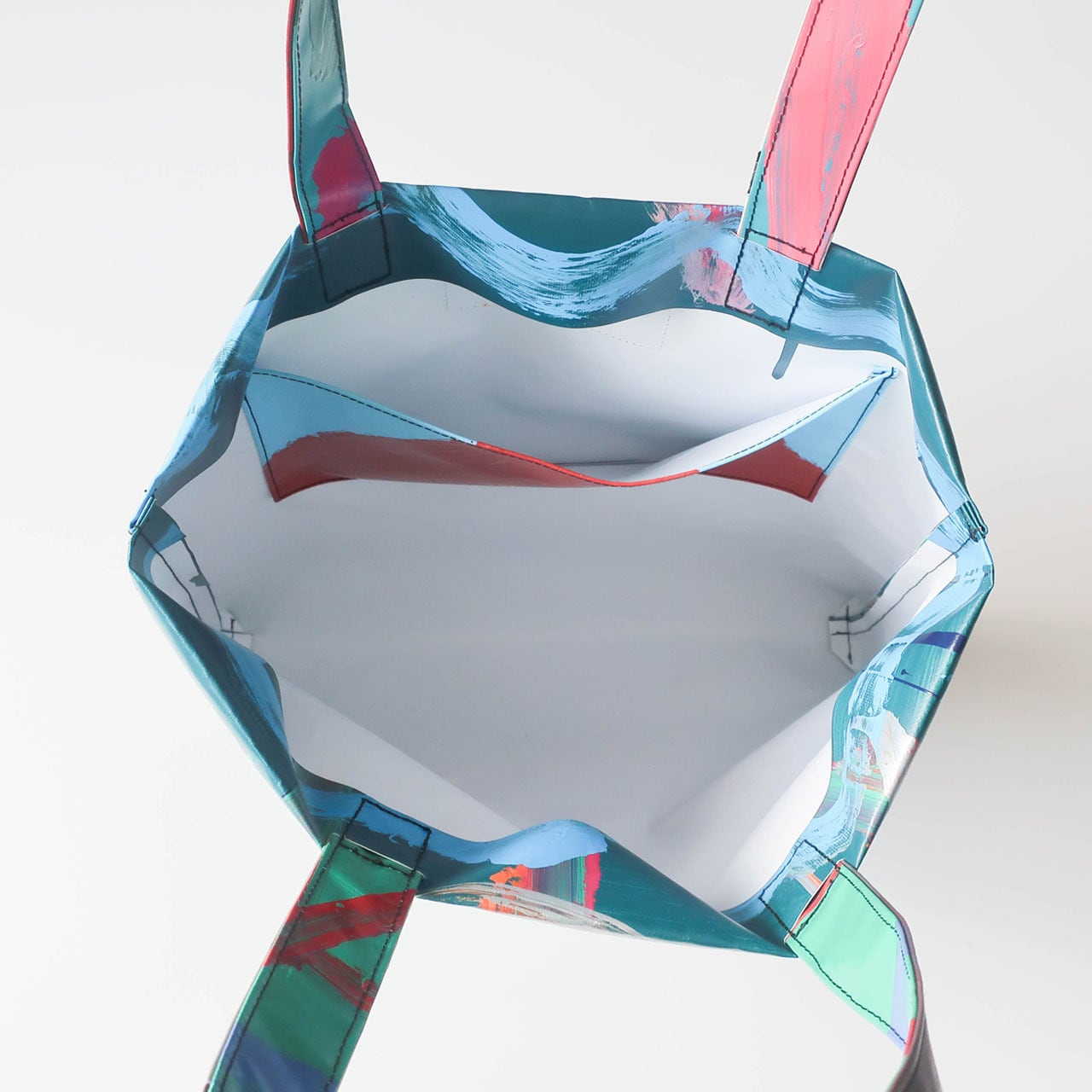 テントの商品をつくり始めた頃、仲間(利用者さん)によるペインティングの仕事を水曜日に行っていたため「水ようびのトート」。(今は月曜日と水曜日に行っています)