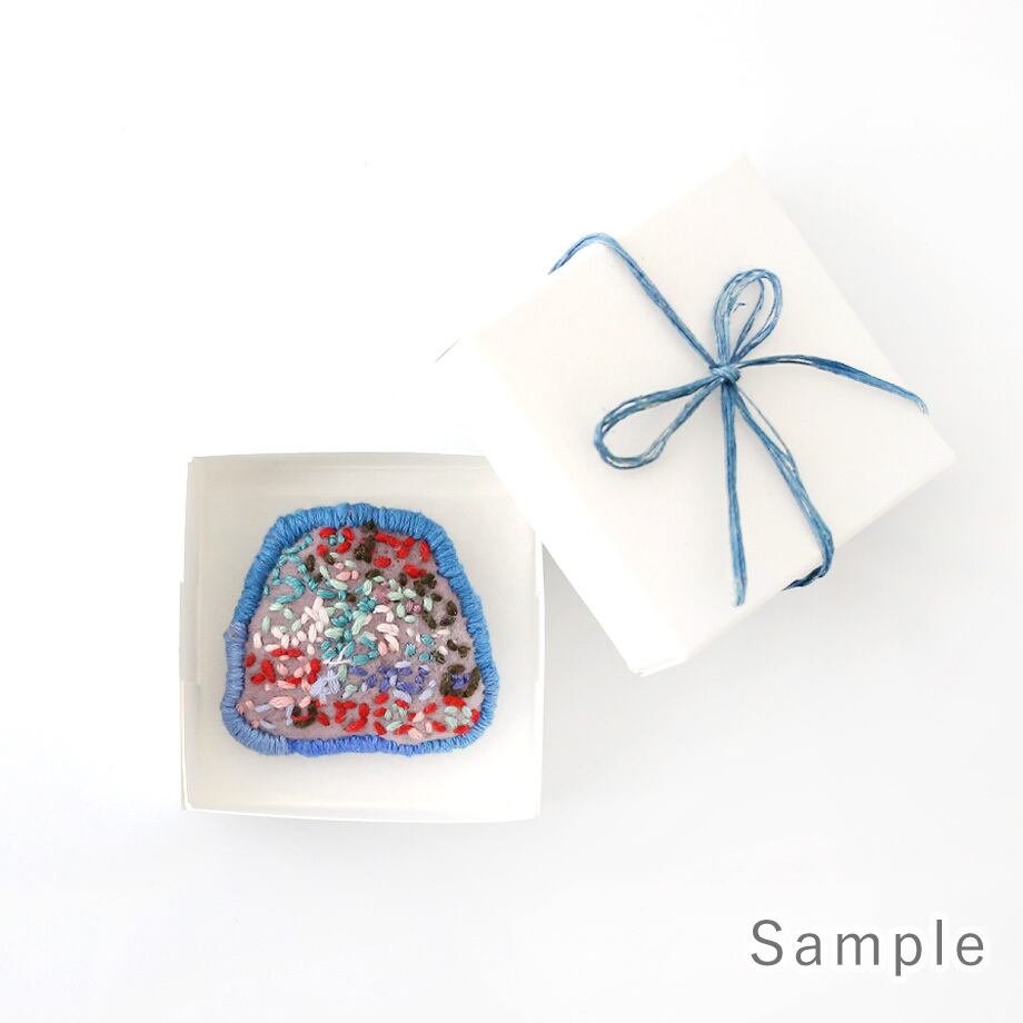 「みっちゃん」こと岡本美乃里さんの刺繍がブローチになりました。白い箱に入れて、リボンをかけて、お届けします。いつもがんばっているご自分へのご褒美に、大切な方への贈り物に、おすすめです。