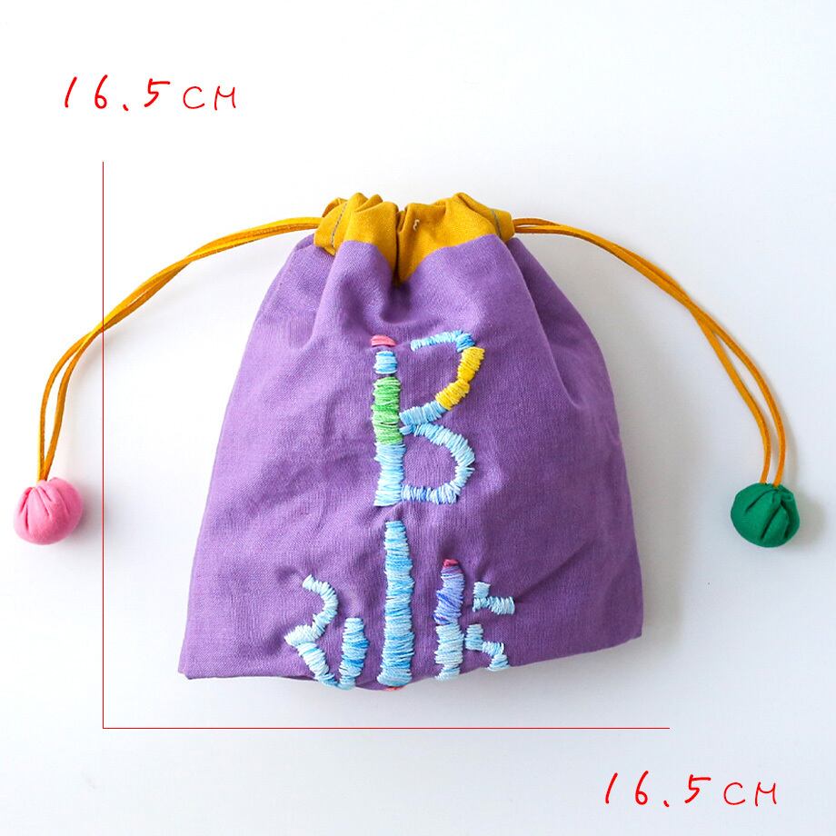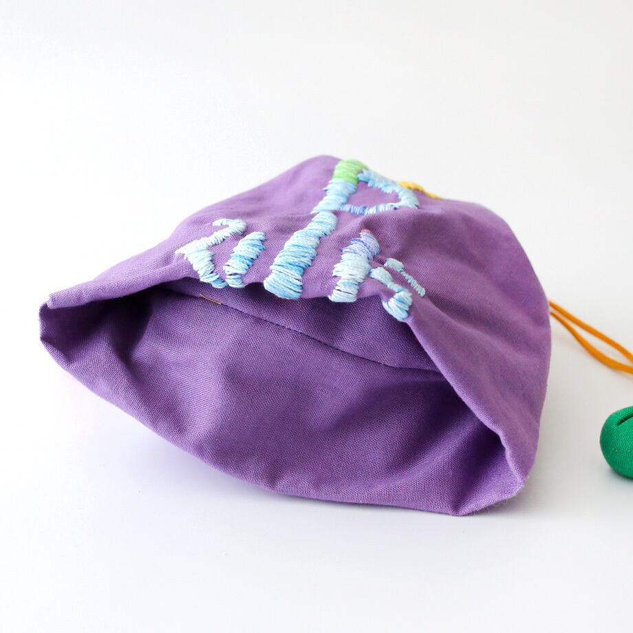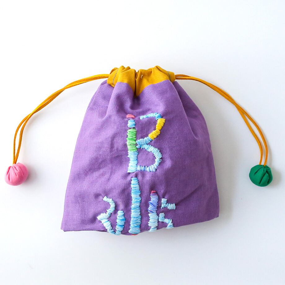 斉藤くんこと、斉藤亮さんの刺繍を、職員さんが巾着に仕立てました。ユニークな色と形の数字がかわいいだけじゃなく、マチがたっぷりとってあったり、裏地がしっかりついていたり、革紐を使っているのでなめらかに開け閉めできたり、機能性もばつぐんなんです!