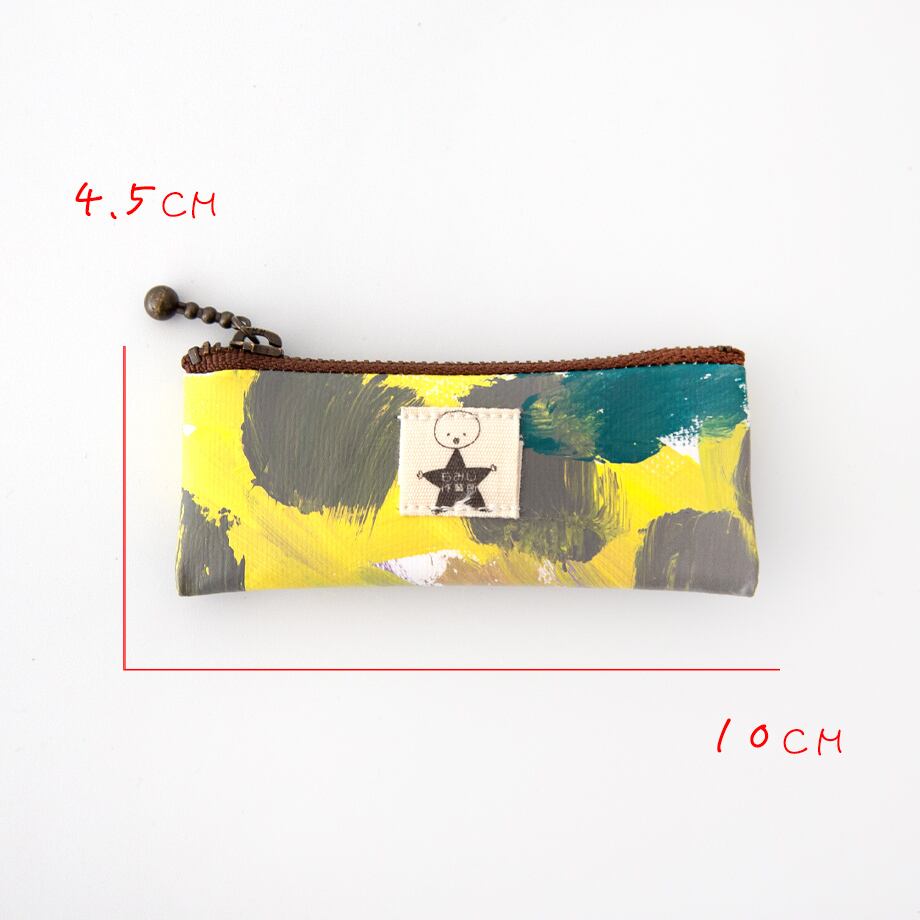 もみじ作業所の一つのグループの活動から生まれた廃材のテント生地を利用したテント商品。時にただ塗っているだけにも見える色合いにも、彼らそれぞれの思いや屈託が表現されたものに感じられるから不思議。そうやって描き、塗られた二つとないテント生地は職員さんの手で裁断し、一部を除いて職員さんが縫製し、カバンやポーチなどカラフルで独特なテント商品へと生まれ変わります。