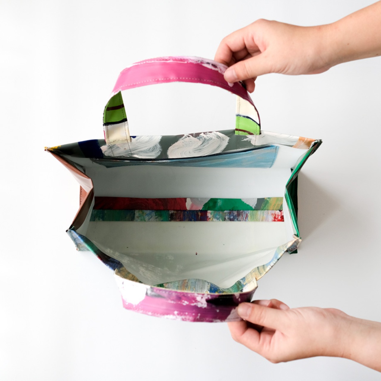テントの商品をつくり始めた頃、仲間(利用者さん)によるペインティングの仕事を水曜日に行っていたため「水ようびのトート」。(今は月曜日と水曜日に行っています)