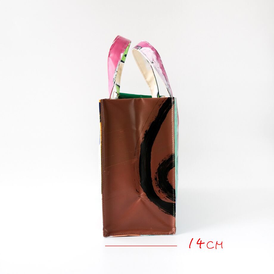マチがたっぷりあるので、見た目以上に収納力があります。側面もペインティングしてあるため、どの角度から見ても楽しいのが、このバックの魅力の1つ♪