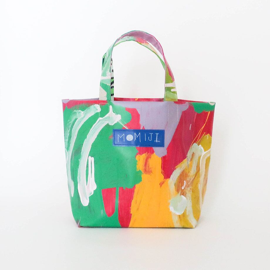 もみじ作業所の一つのグループの活動から生まれた廃材のテント生地を利用したテント商品。時にただ塗っているだけにも見える色合いにも、彼らそれぞれの思いや屈託が表現されたものに感じられるから不思議。そうやって描き、塗られた二つとないテント生地は職員の手で裁断し、一部を除いて職員が縫製し、カバンやポーチなどカラフルで独特なテント商品へと生まれ変わります。